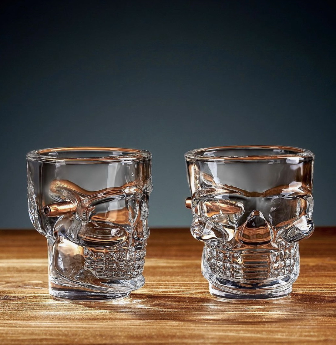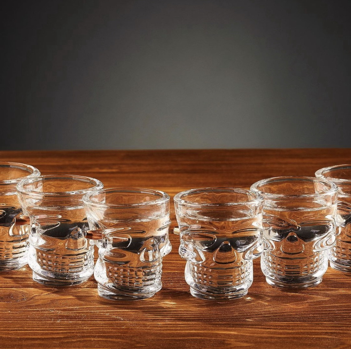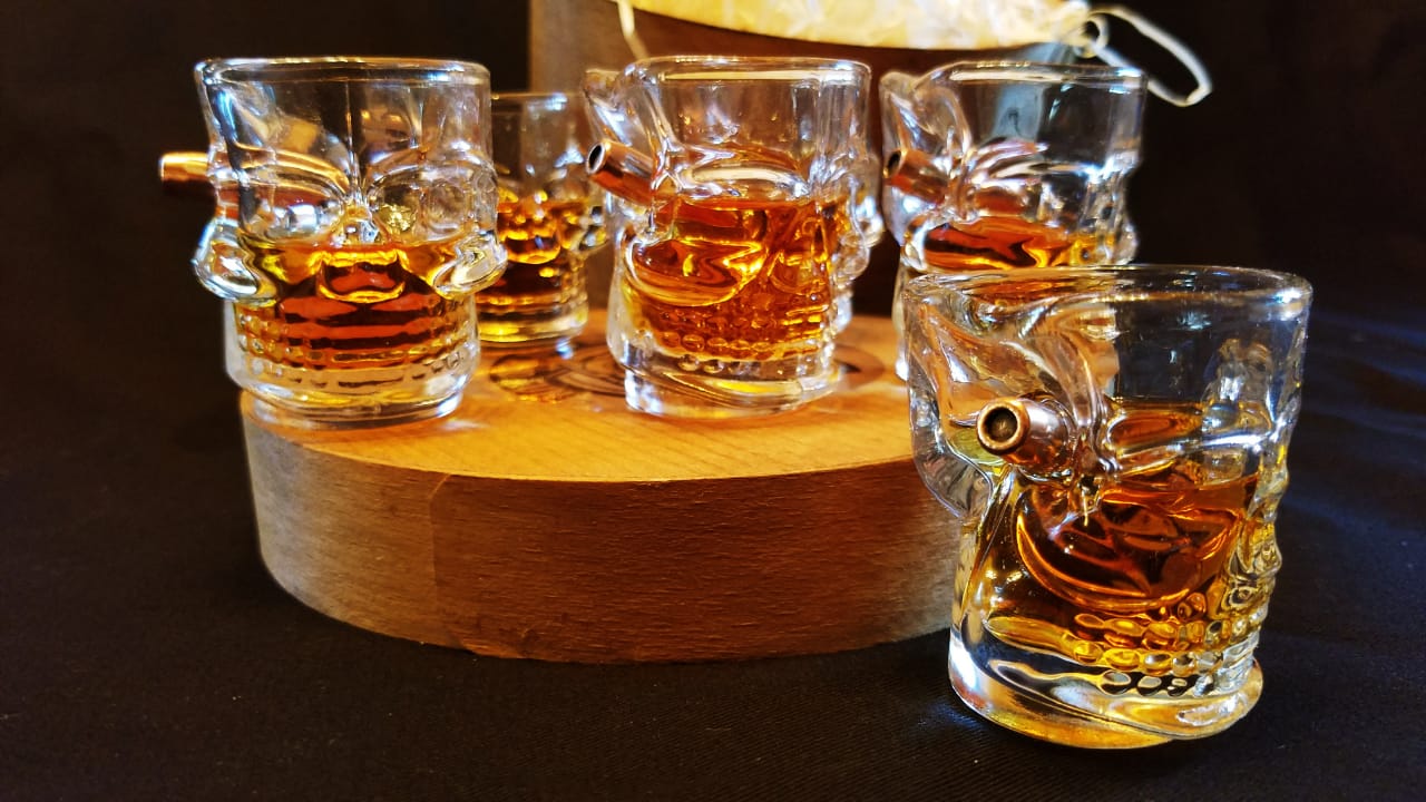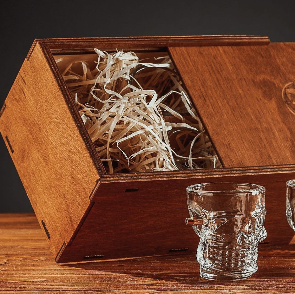Эксклюзив! Набор из шести штук рюмок-черепов с пулей 7.62 со следами нарезов. Идут в качественной большой деревянной коробоке с опилками.