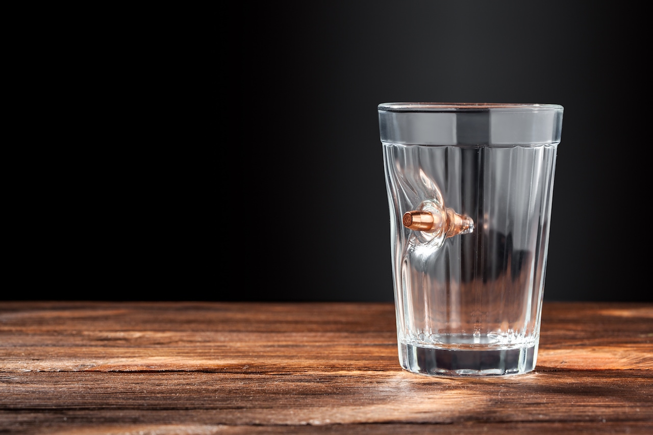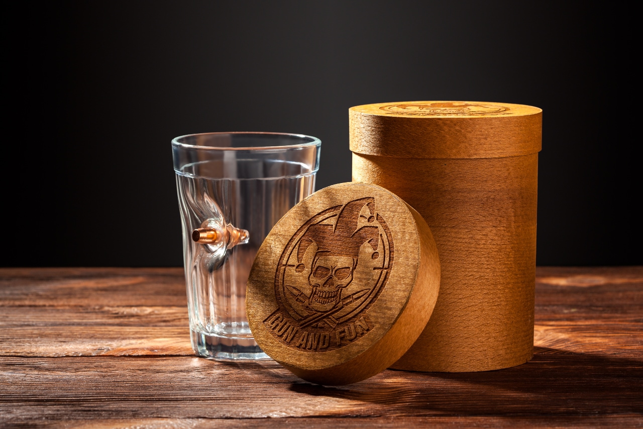 Гранена склянка ретро ручної роботи зі справжньою кулею 7.62мм – чудово підійде для обмивки звання або просто для відпочинку в чоловічій компанії. Запакований у дерев'яний подарунковий тубус із тирсою.
